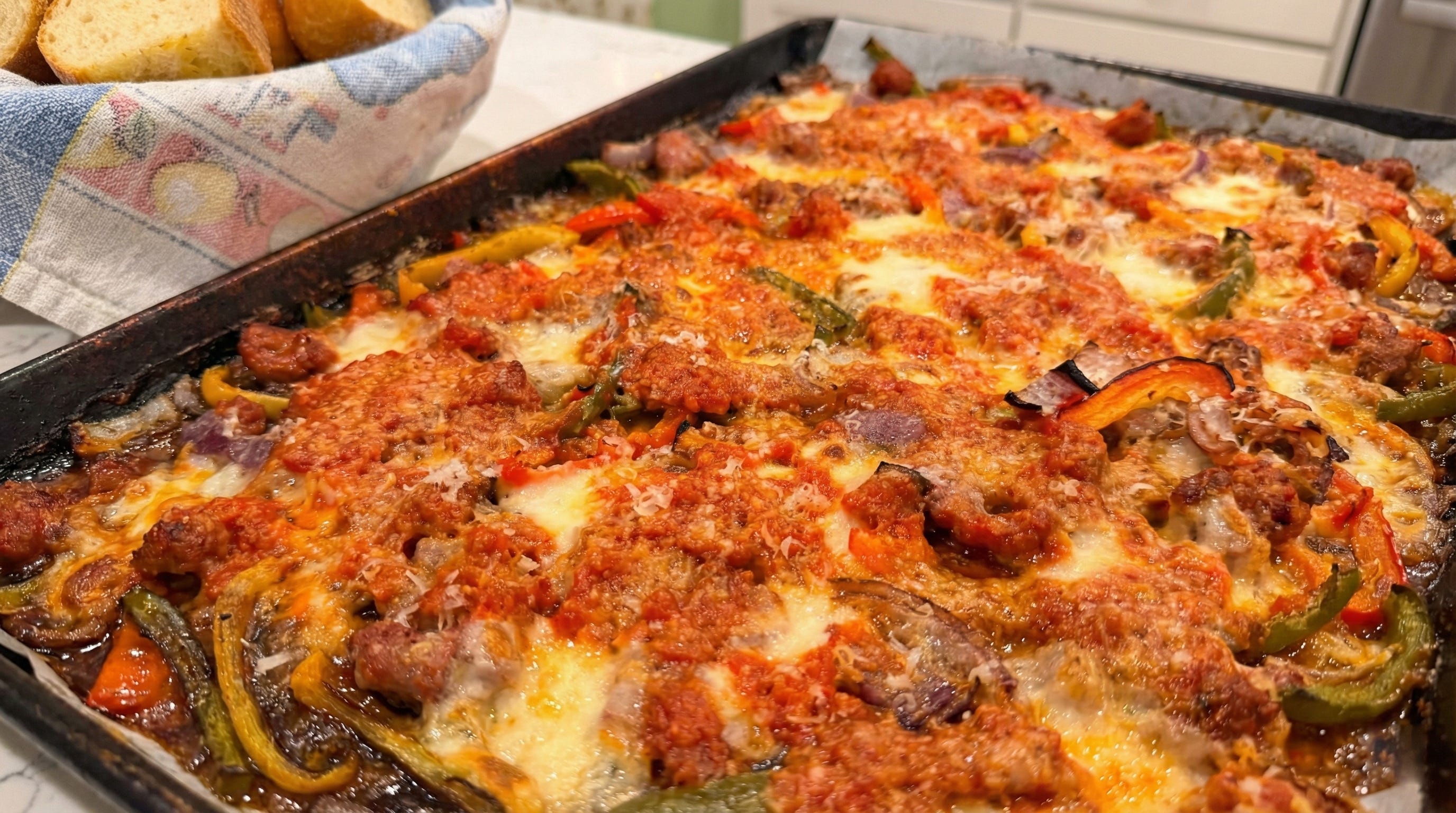 Whether you’re serving it a party or just feeding your family, they will absolutely love how fun this recipe is to eat. It’s almost like a sausage and pepper dip. Rip off a great piece of bread and scoop up a mouthful right off the pan. It is oddly satisfying to do it this way.